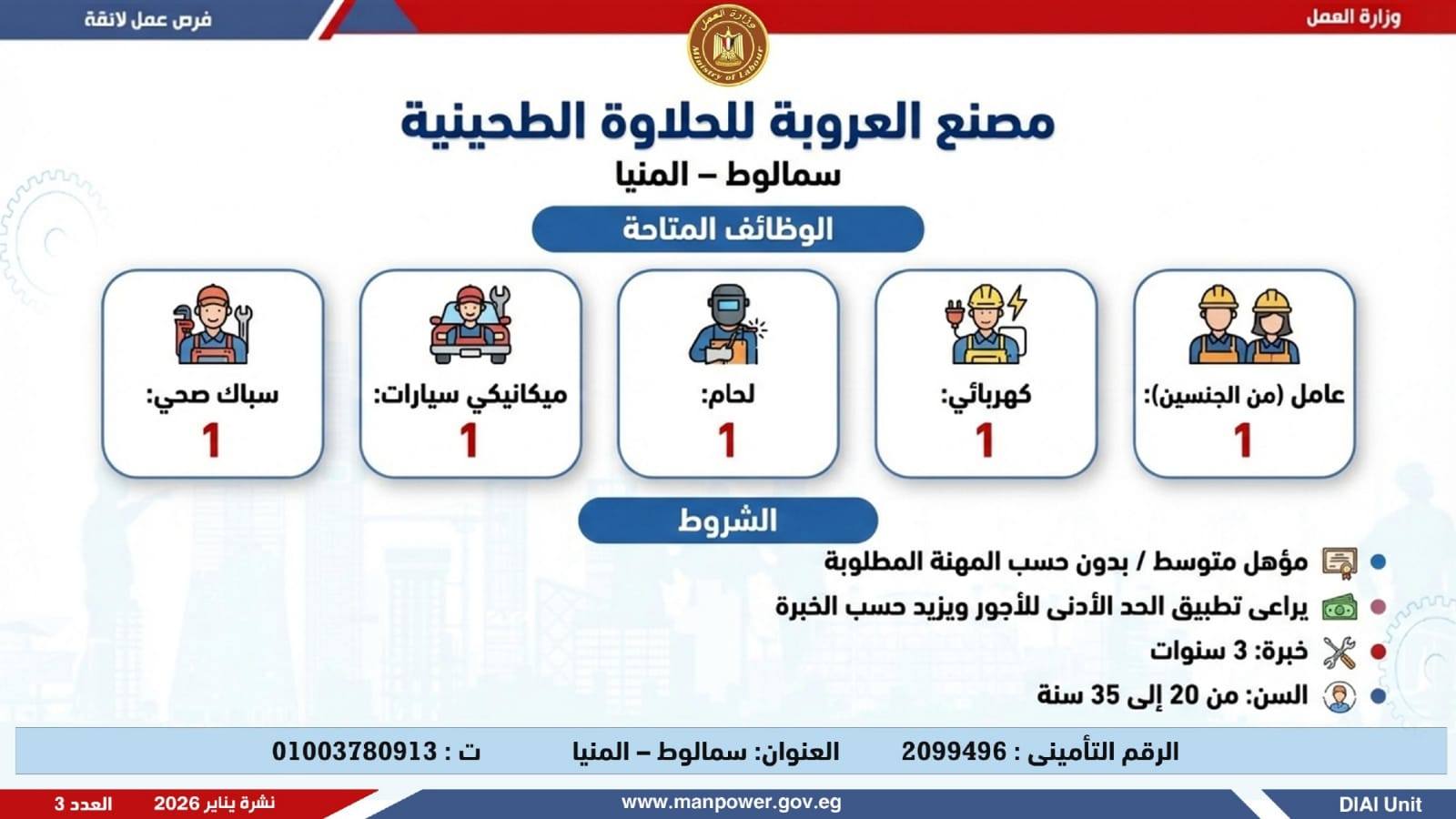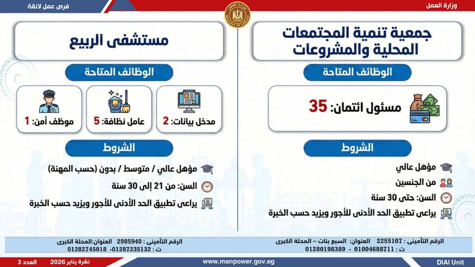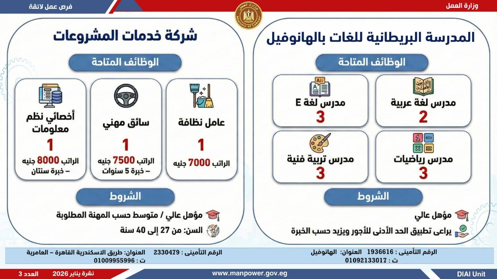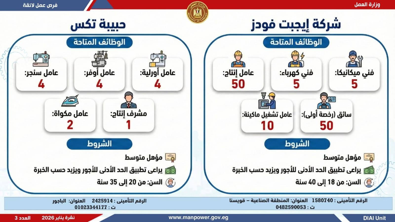 في إطار التزام الدولة بمواجهة البطالة، ودعم جهود التشغيل، وتعزيز الشراكة مع القطاع الخاص، أعلن وزير العمل محمد جبران، اليوم الثلاثاء، عن إصدار نشرة التوظيف نصف الشهرية، والتي تتضمن توفير 4379 فرصة عمل جديدة بالتعاون مع 37 شركة من شركات القطاع الخاص، موزعة على 12 محافظة، مع إتاحة التقديم خلال شهر فبراير 2026.