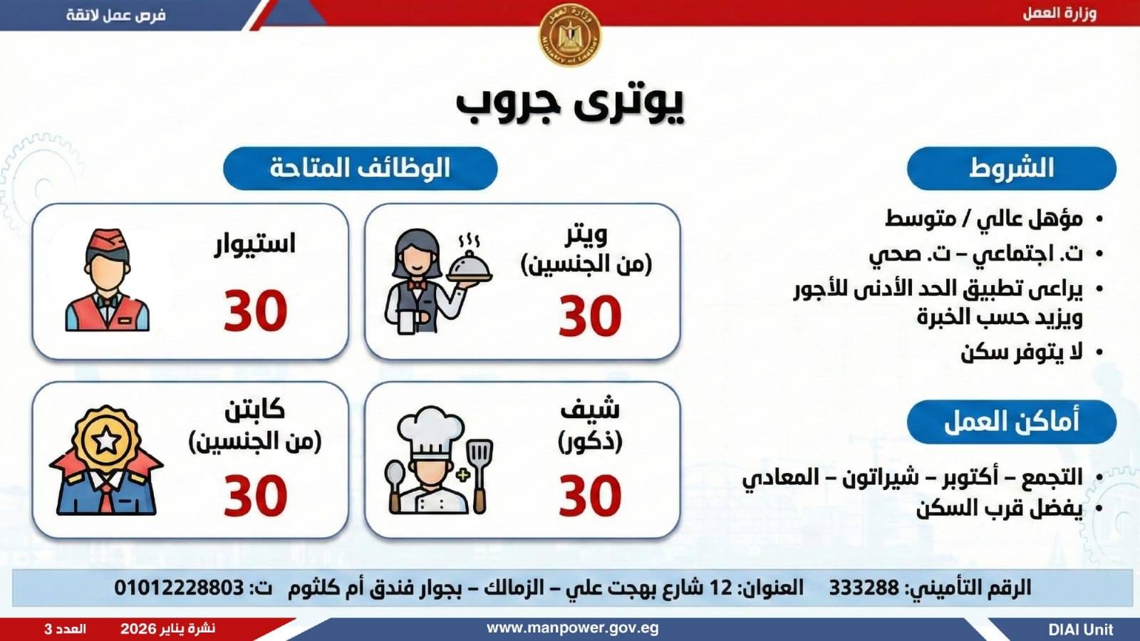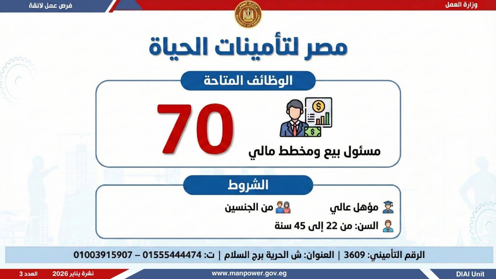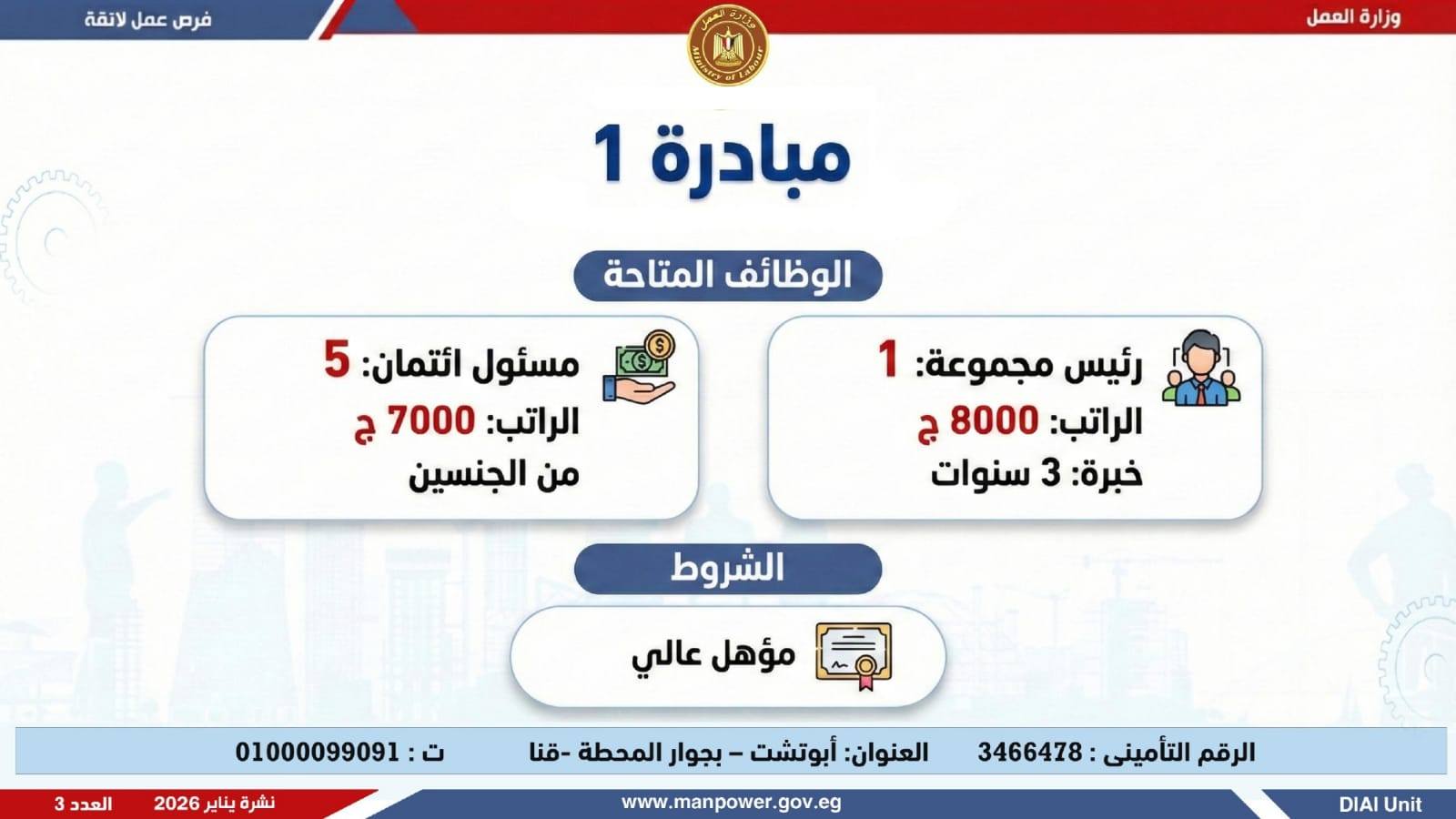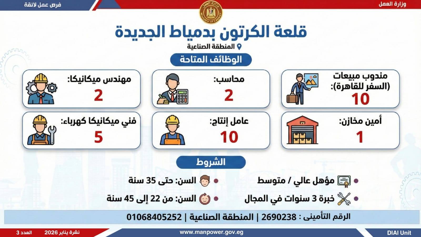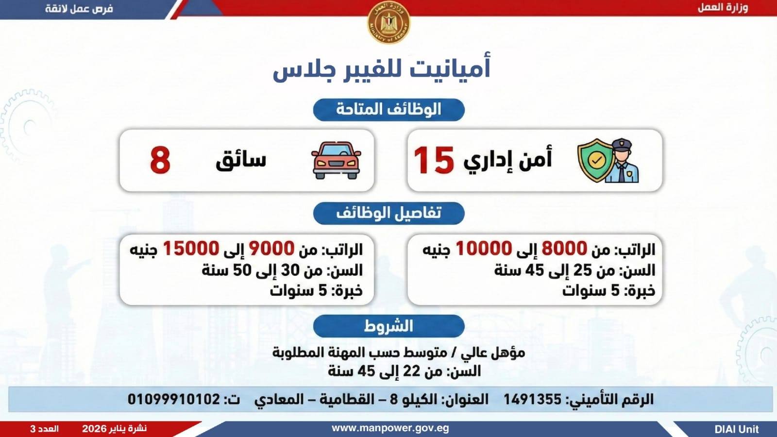 في إطار التزام الدولة بمواجهة البطالة، ودعم جهود التشغيل، وتعزيز الشراكة مع القطاع الخاص، أعلن وزير العمل محمد جبران، اليوم الثلاثاء، عن إصدار نشرة التوظيف نصف الشهرية، والتي تتضمن توفير 4379 فرصة عمل جديدة بالتعاون مع 37 شركة من شركات القطاع الخاص، موزعة على 12 محافظة، مع إتاحة التقديم خلال شهر فبراير 2026.