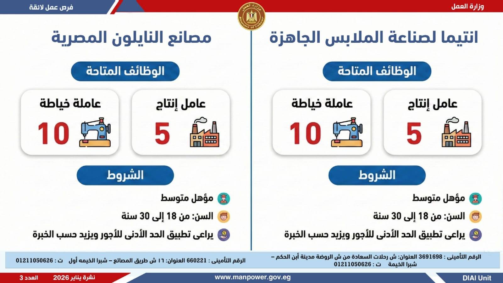 وأكدت الوزارة أن النشرة تتضمن عددًا من الوظائف المخصصة لذوي الهمم، تنفيذًا لأحكام القانون رقم 10 لسنة 2018 بشأن حقوق الأشخاص ذوي الإعاقة، والذي يُلزم المنشآت بتخصيص نسبة 5% من إجمالي العاملين بها لهذه الفئة، وذلك في إطار خطة الوزارة لحصر وتدريب وتشغيل ذوي الهمم ودمجهم في سوق العمل، تنفيذًا لتوجيهات فخامة الرئيس عبدالفتاح السيسي، رئيس الجمهورية، بتمكينهم اقتصاديًا ومجتمعيًا، وتحقيق دمج كامل ومستدام لهم في سوق العمل.