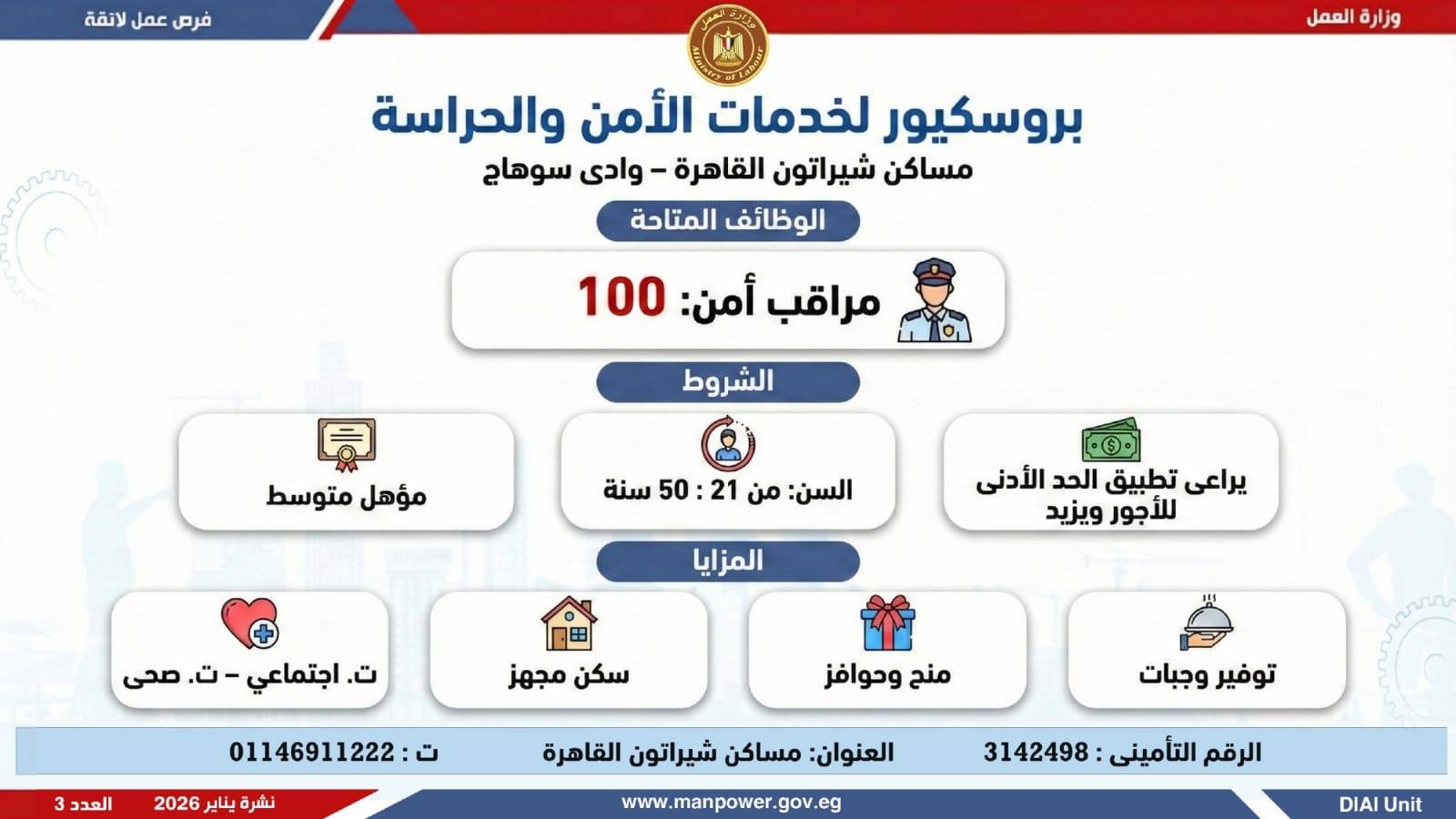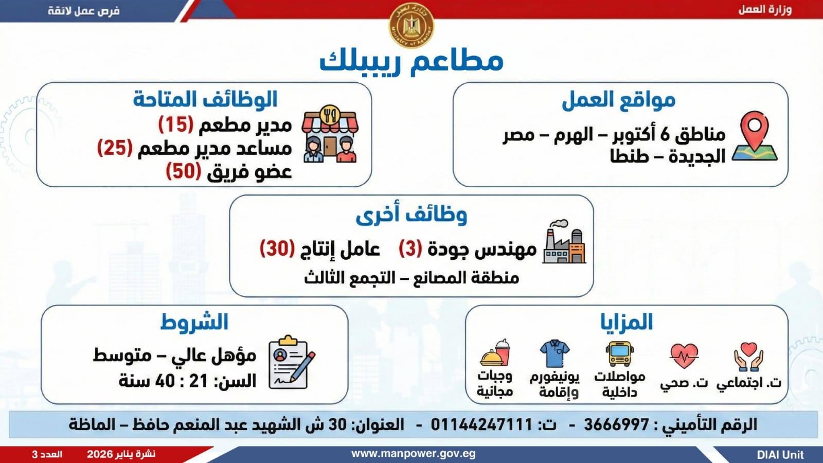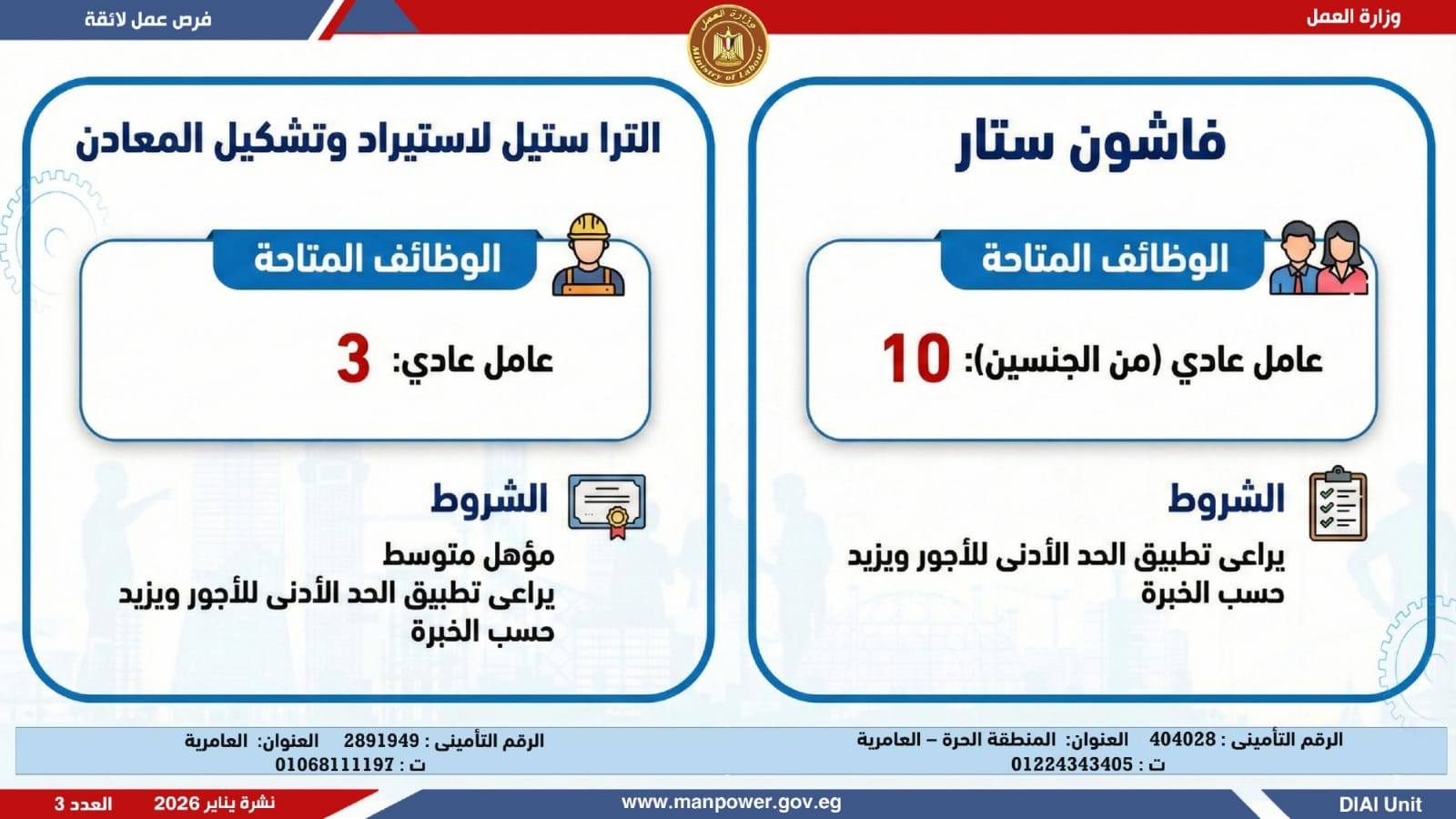 وتغطي النشرة الحالية فرص عمل بمحافظات: القاهرة، القليوبية، الإسكندرية، الغربية، الإسماعيلية، المنيا، سوهاج، بني سويف، والمنوفية، قنا، ودمياط والفيوم.تخصصات متعددة، من بينها:أخصائيو تسويق وموارد بشرية، مهندسو اتصالات وكهرباء، مشرفو ميكانيكا وتحكم كهربائي،مديرو صيانة، محاسبون، مشرفو مواقع وتنجيد، (ليدي جارد – إناث)، مشرفو إنتاج، شيفات، أخصائيو مشتريات، بائعون، مقدمو طلبات، أمناء مخازن، مندوبو مبيعات، مراقبو جودة، فنيون بمختلف التخصصات، سائقون برخص أولى وثانية وثالثة، أفراد أمن، إلى جانب فرص في قطاع الفندقة والمطاعم، وأعمال إنتاج ونظافة وتخصصات أخرى.
