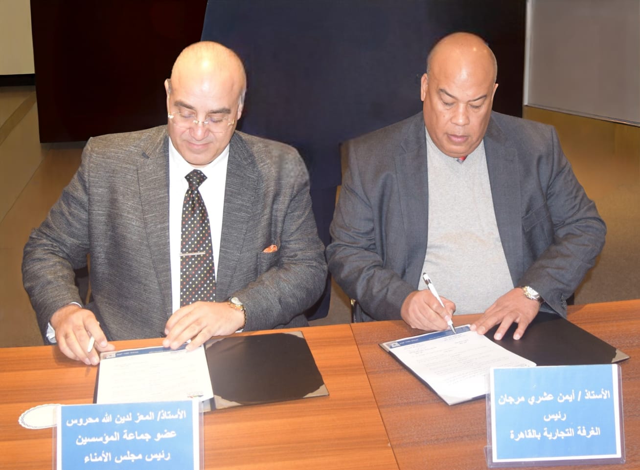 وقّع عن الغرفة التجارية للقاهرة أيمن العشري، وعن المؤسسة العربية لخبراء الحماية الاجتماعية الدكتور المعز لدين الله محروس، رئيس مجلس الأمناء.