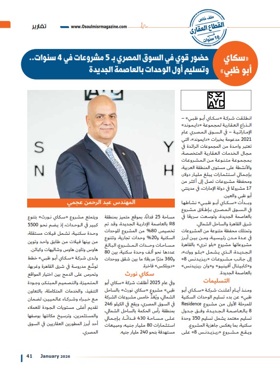 «سكاي أبو ظبي» حضور قوي في السوق المصري بـ 5 مشروعات في 4 سنوات.. وتسليم أول الوحدات بالعاصمة الجديدة