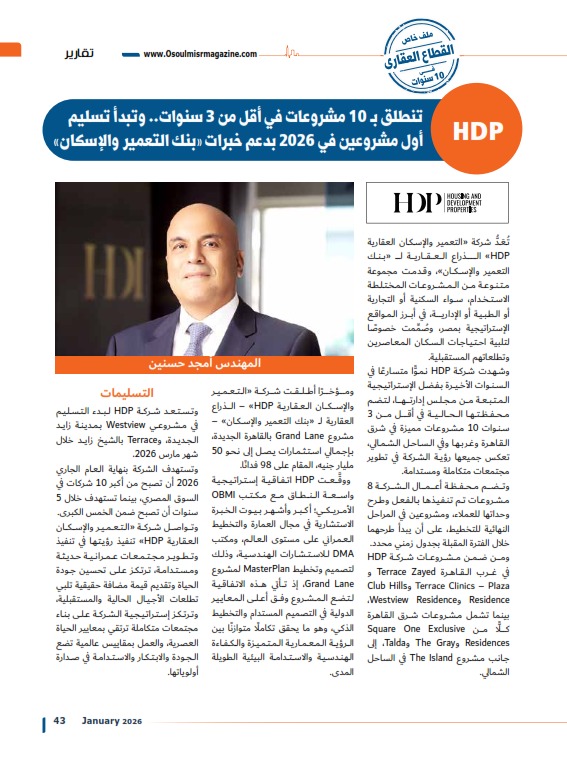 HDP تنطلق بـ 10 مشروعات في أقل من 3 سنوات.. وتبدأ تسليم أول مشروعين في 2026 بدعم خبرات «بنك التعمير والإسكان»