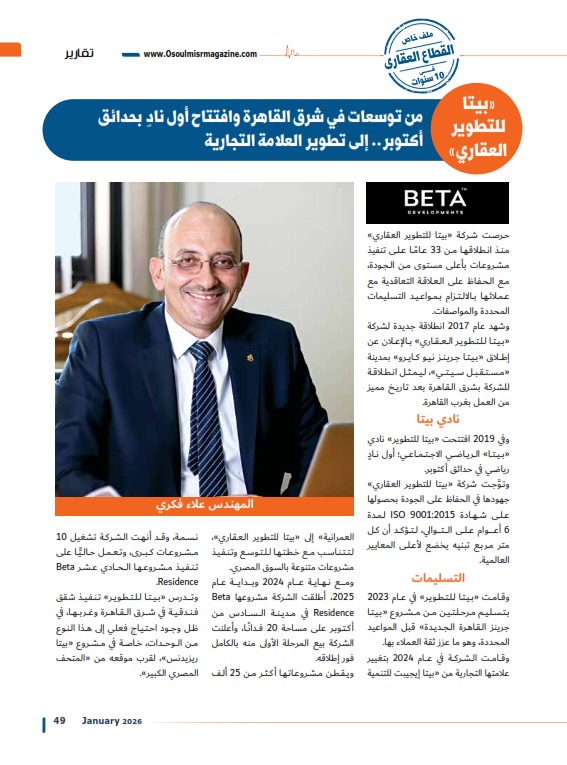 «بيتا للتطوير العقاري» من توسعات في شرق القاهرة وافتتاح أول نادٍ بحدائق أكتوبر.. إلى تطوير العلامة التجارية