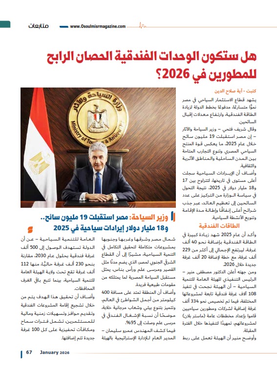 وأكد أن عام 2025 شهد زيادة كبيرة في الطاقة الفندقية بإضافة نحو 40 ألف غرفة، ليرتفع الإجمالي إلى أكثر من 229 ألف غرفة، مع خطة لإضافة 20 ألف غرفة جديدة خلال 2026.
