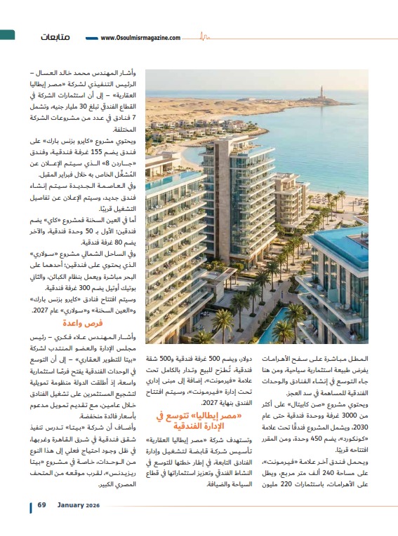 وأشار المهندس محمد خالد العسال – الرئيس التنفيذي لشركة «مصر إيطاليا العقارية» – إلى أن استثمارات الشركة في القطاع الفندقي تبلغ 30 مليار جنيه، وتشمل 7 فنادق في عدد من مشروعات الشركة المختلفة.