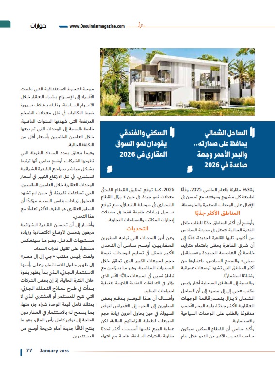 في ظل المتغيرات الاقتصادية المحلية والعالمية، يواصل السوق العقاري المصري إعادة ترتيب أولوياته استعدادًا لمرحلة أكثر توازنًا خلال عام 2026، وسط تساؤلات حول اتجاهات الأسعار، وأكثر المناطق جذبًا للاستثمار، والقطاعات المتوقع لها تحقيق أعلى معدلات نمو، إلى جانب التحديات التمويلية والتنفيذية التي تواجه المطورين.