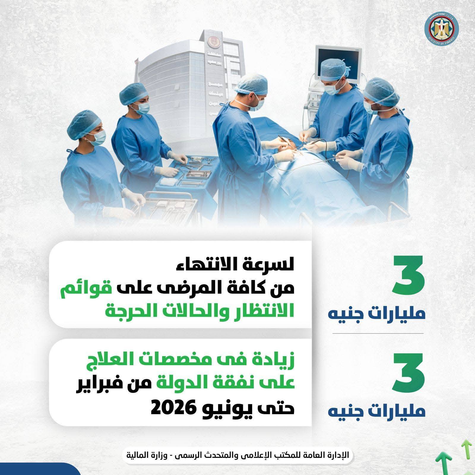 أكد كجوك أن الحزمة تتضمن 3 مليارات جنيه لسرعة الانتهاء من قوائم انتظار المرضى والحالات الحرجة، بالإضافة إلى 3 مليارات جنيه زيادة في مخصصات العلاج على نفقة الدولة لمحدودي الدخل الذين ليس لديهم تغطية تأمينية من فبراير حتى يونيو 2026، تنفيذاً لتوجيهات الرئيس بعلاج جميع الحالات الحرجة على نفقة الدولة قبل عيد الفطر.