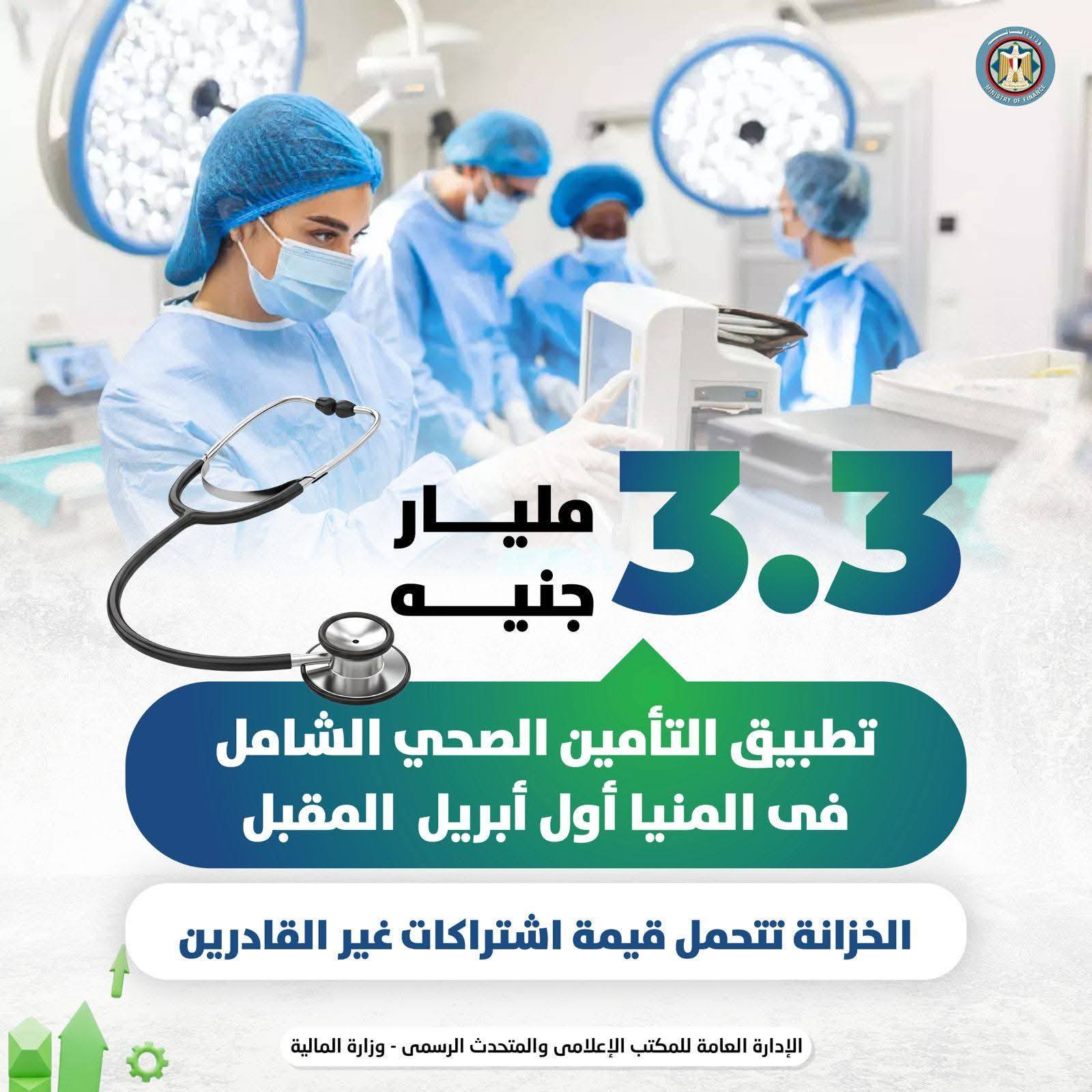 كما أعلن الوزير عن تخصيص 3,3 مليار جنيه لتبكير دخول التأمين الصحي الشامل بمحافظة المنيا اعتبارًا من أول أبريل، على أن تتحمل الدولة قيمة اشتراكات غير القادرين في هذه المنظومة.