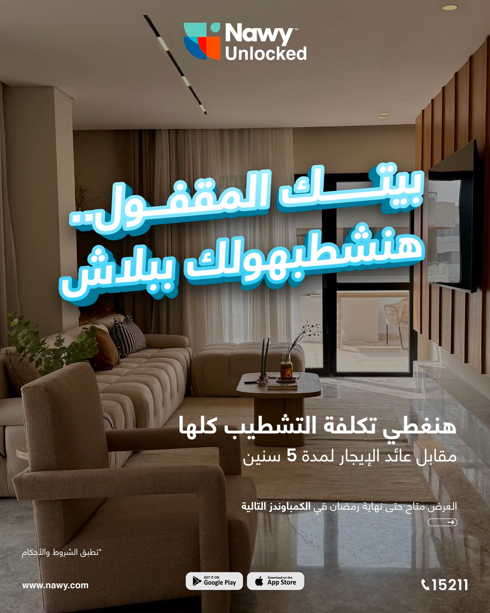 أعلنت شركة ناوي - Nawy عن إطلاق عرض جديد من خلال Nawy Unlocked، يتضمن تحمل الشركة 100% من تكلفة تشطيب الوحدات السكنية، مقابل حصولها على عائد الإيجار لمدة 5 سنوات.