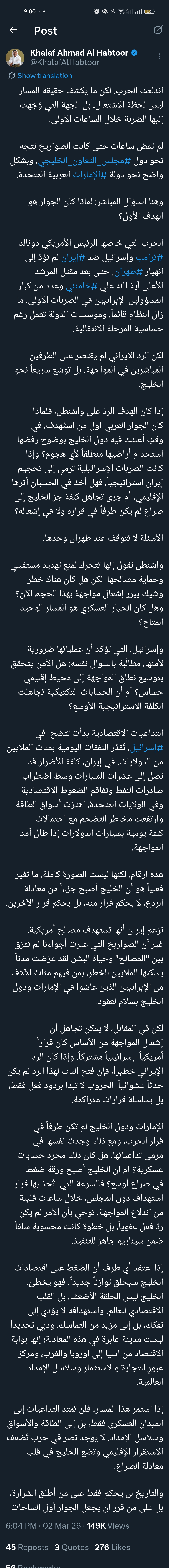 وقال عبر منصة إكس: "اندلعت الحرب. لكن ما يكشف حقيقة المسار ليس لحظة الاشتعال، بل الجهة التي وُجّهت إليها الضربة خلال الساعات الأولى.