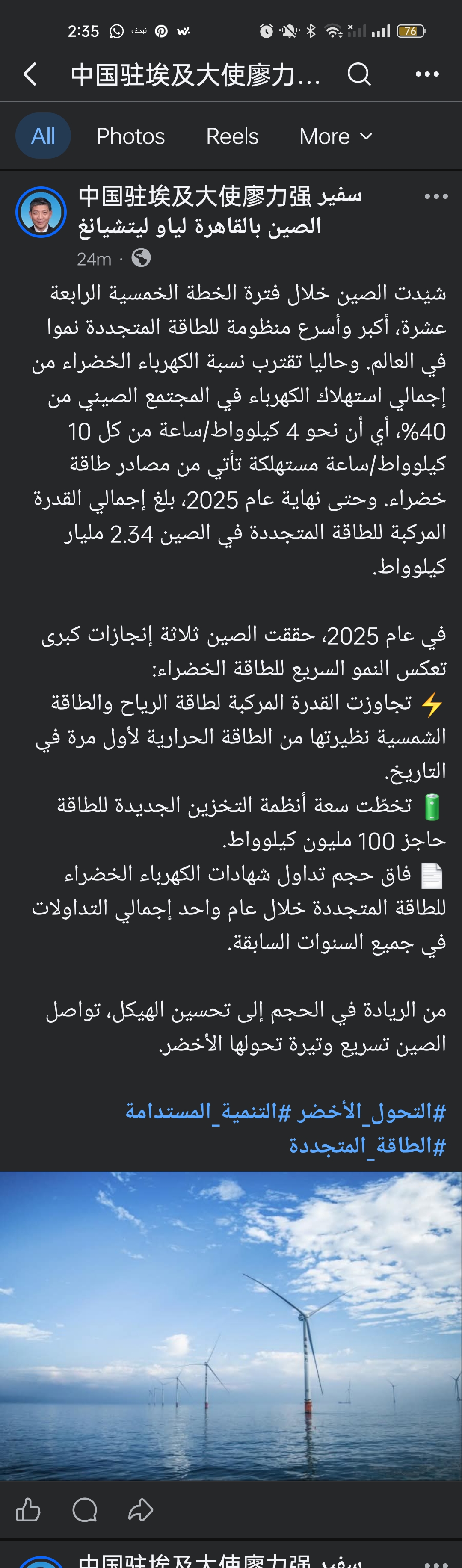 وأوضح السفير خلال صفحته على فيسبوك، أن إجمالي القدرة المركبة للطاقة المتجددة في الصين بلغ حتى نهاية عام 2025 نحو 2.34 مليار كيلوواط.