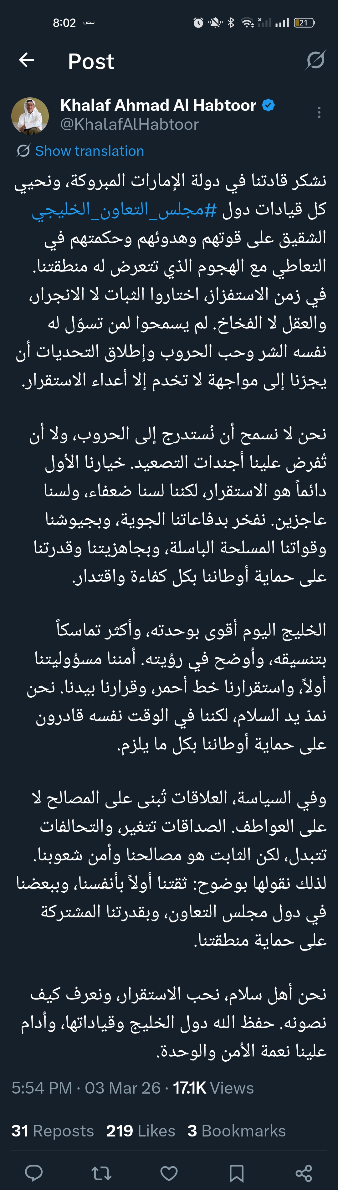 وقال “نحن أهل سلام، نحب الاستقرار، ونعرف كيف نصونه. حفظ الله دول الخليج وقياداتها، وأدام علينا نعمة الأمن والوحدة”.