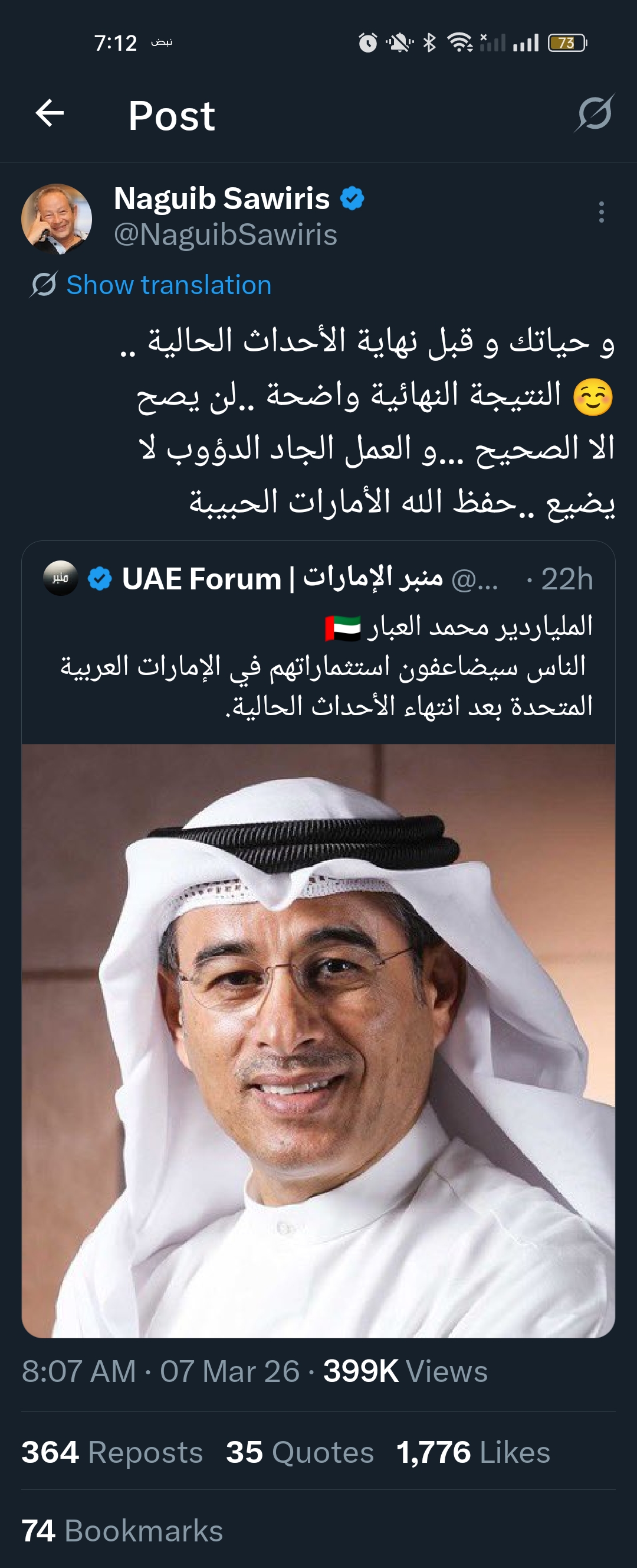 وجاء تعليق ساويرس بعد تصريحات أدلى بها العبار لشبكة CNBC، توقع خلالها أن يشهد الاستثمار في الإمارات زيادة ملحوظة عقب انتهاء التوترات الراهنة.