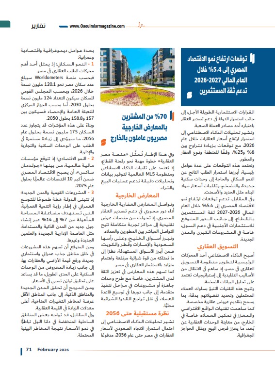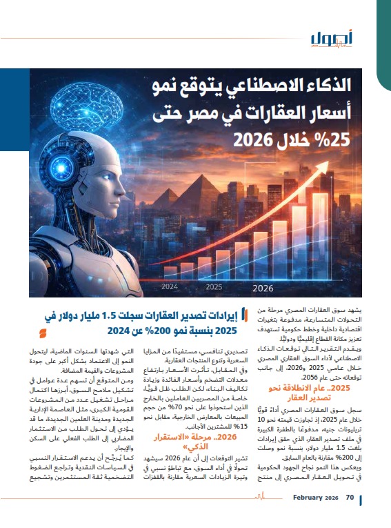 كما يُرجَّح أن يدعم الاستقرار النسبي في السياسات النقدية وتراجع الضغوط التضخمية ثقة المستثمرين وتشجيع القرارات الاستثمارية الطويلة الأجل، إلى جانب استمرار الدولة في دعم تصدير العقار باعتباره أحد مصادر العملة الصعبة.