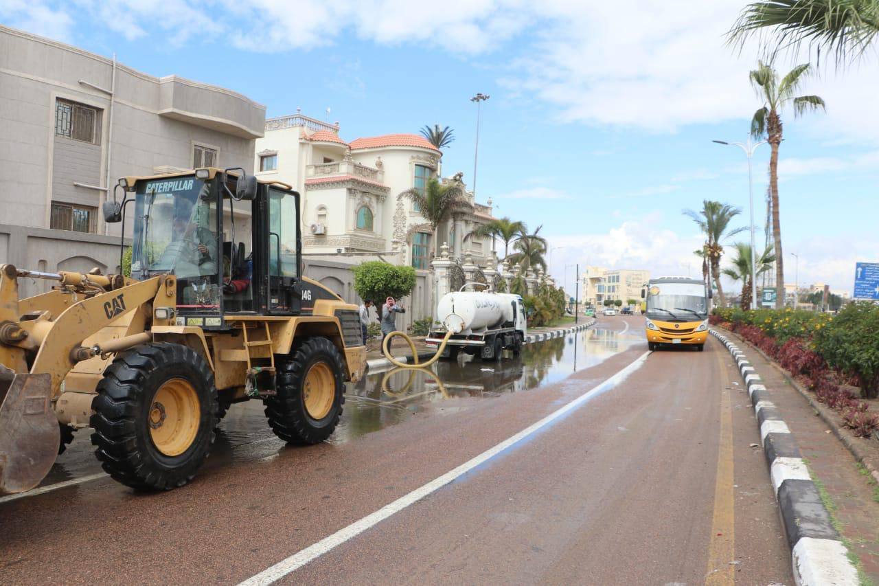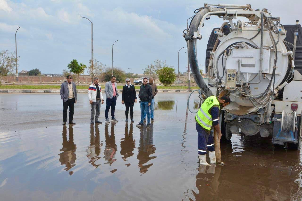وفي مدينة السويس الجديدة، تمت متابعة أعمال سحب وشفط مياه الأمطار ميدانياً، والتأكد من كفاءة شبكات التصريف وانتظام عملها، مع الدفع بفرق العمل والمعدات إلى المناطق الحيوية، ومنها الطريق الساحلي والحي الصناعي والمنطقة الحرة، للتعامل الفوري مع تجمعات المياه.