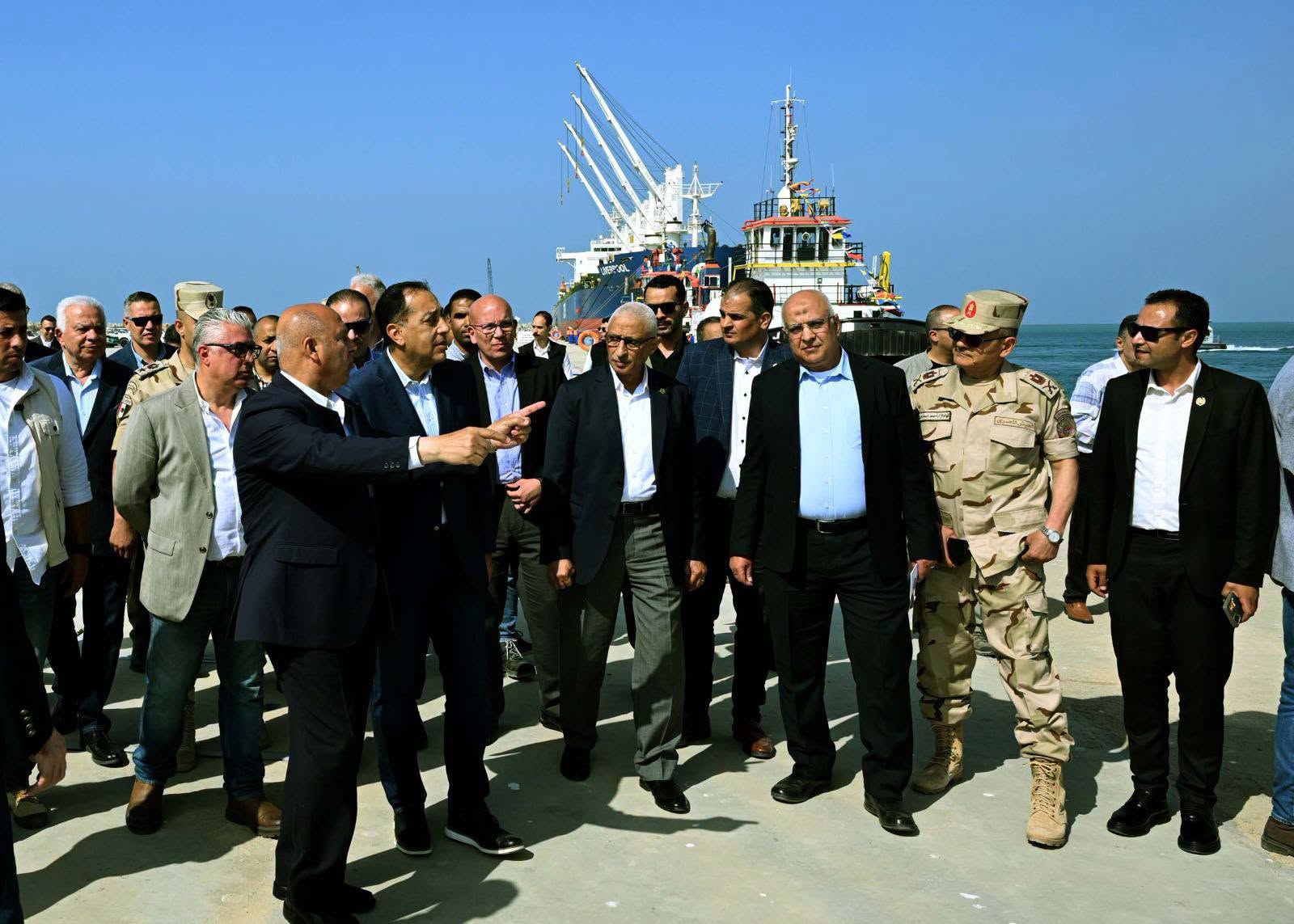 ورافق رئيس الوزراء في الميناء كل من الفريق مهندس/ كامل الوزير، وزير النقل، والدكتورة منال عوض، وزيرة التنمية المحلية والبيئة، والمهندسة/ راندة المنشاوي، وزيرة الإسكان والمرافق والمجتمعات العمرانية، واللواء الدكتور/ خالد مجاور، محافظ شمال سيناء.