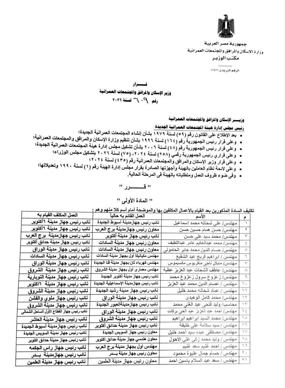 بالأسماء.. «الإسكان» تصدر قرارًا بتعيين 25 مهندسًا شابًّا نوابًا لرؤساء أجهزة المدن