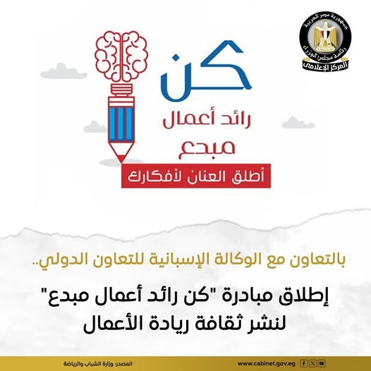 أعلنت وزارة الشباب والرياضة إطلاق مبادرة «كن رائد أعمال مبدع»، في إطار جهودها لتمكين الشباب ودعم الطاقات الابتكارية، عبر نشر ثقافة ريادة الأعمال وتحفيزهم على تحويل أفكارهم إلى مشروعات قابلة للتنفيذ.