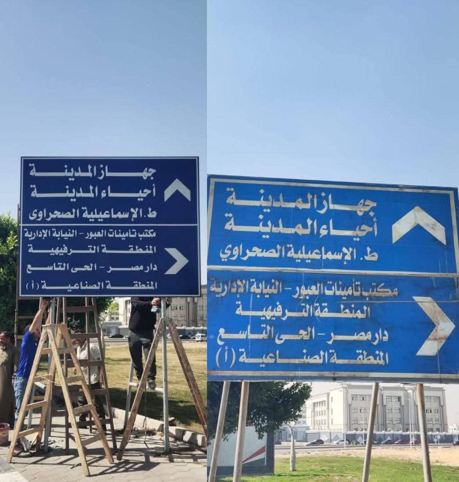 في إطار التوجيهات بضرورة الارتقاء بمستوى السلامة المرورية وتحسين كفاءة الطرق والمحاور الرئيسية، وتنفيذاً لتعليمات السيد المهندس/ تامر جبر " رئيس جهاز تنمية مدينة العبور "، تواصل الادارات التنفيذية أعمال رفع كفاءة وصيانة اللوحات الإرشادية والتحذيرية بالمحور الغربي.