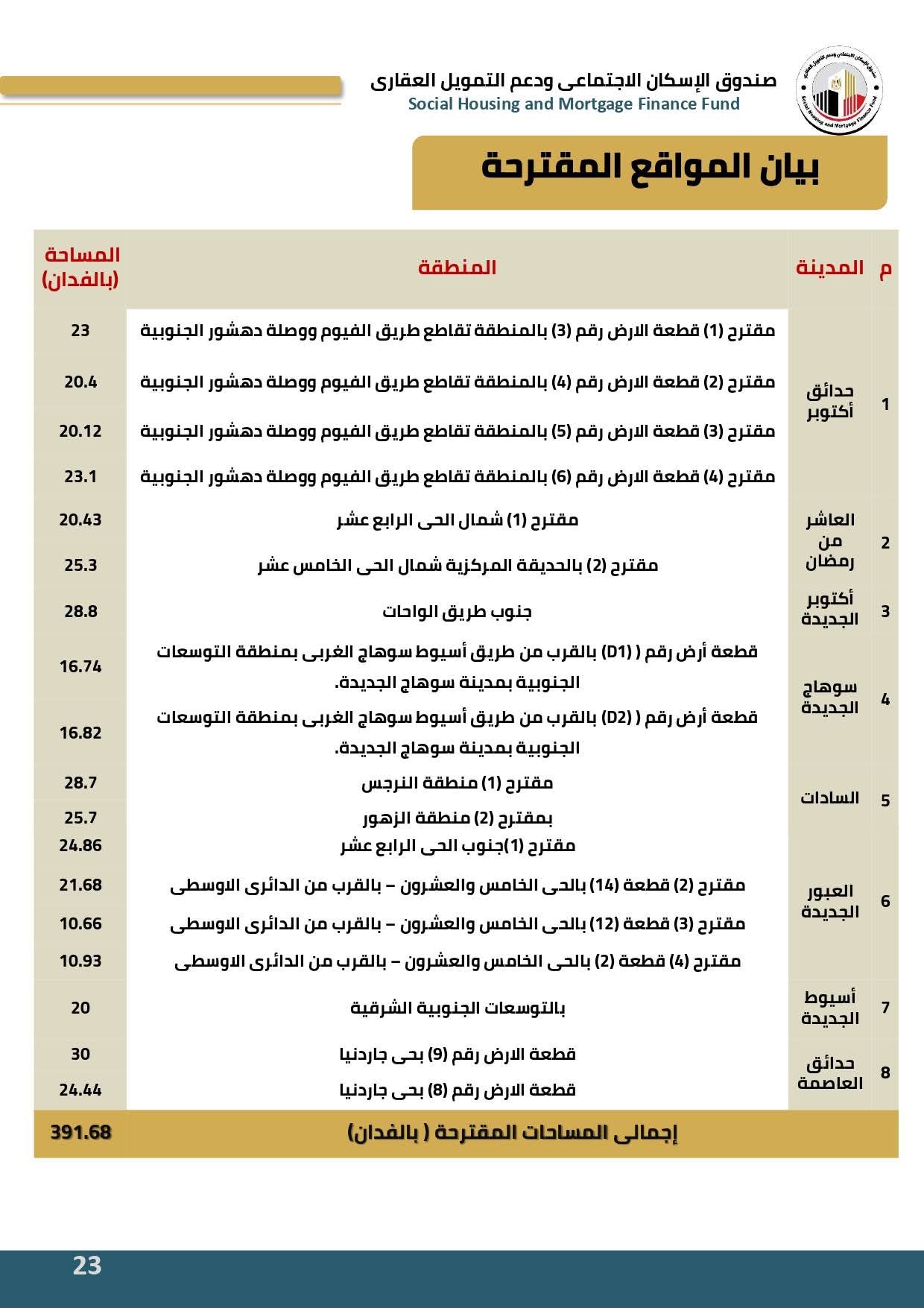 كما تم طرح قطعة أرض واحدة في مدينة سوهاج الجديدة بالقرب من طريق أسيوط – سوهاج الغربي، وتتضمن مدينة السادات طرح قطعتي أرض في منطقتي النرجس والزهور، بينما تشهد مدينة العبور الجديدة طرح 4 قطع أراضٍ، حيث تقع القطعة الأولى جنوب الحي الرابع عشر، بينما تقع الثلاث قطع الأخرى بالحي الخامس والعشرين بالقرب من الطريق الدائري الأوسطي، وهي قطع الأراضي أرقام ( 2، و12، و14).