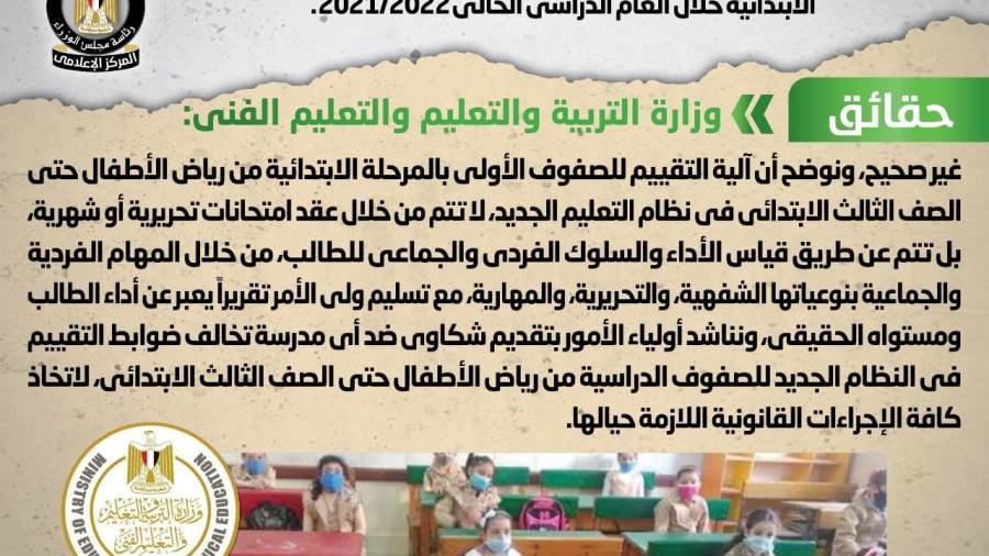 نفى المركز الإعلامي لمجلس الوزراء ما انتشر في بعض المواقع الإلكترونية وصفحات التواصل الاجتماعي بشأن عقد اختبارات شهرية تحريرية لطلاب الصفوف الأولى من المرحلة الابتدائية خلال العام الدراسي الحالي 2021/2022.