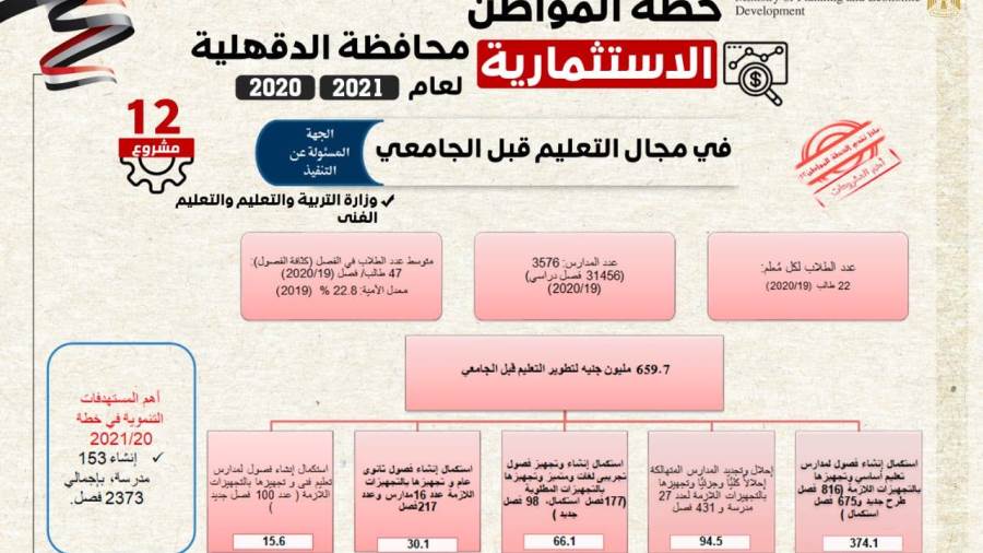 أعلنت وزارة التخطيط والتنمية الاقتصادية ملامح خطة المواطن الاستثمارية في محافظة الدقهلية للعام المالي 20/20