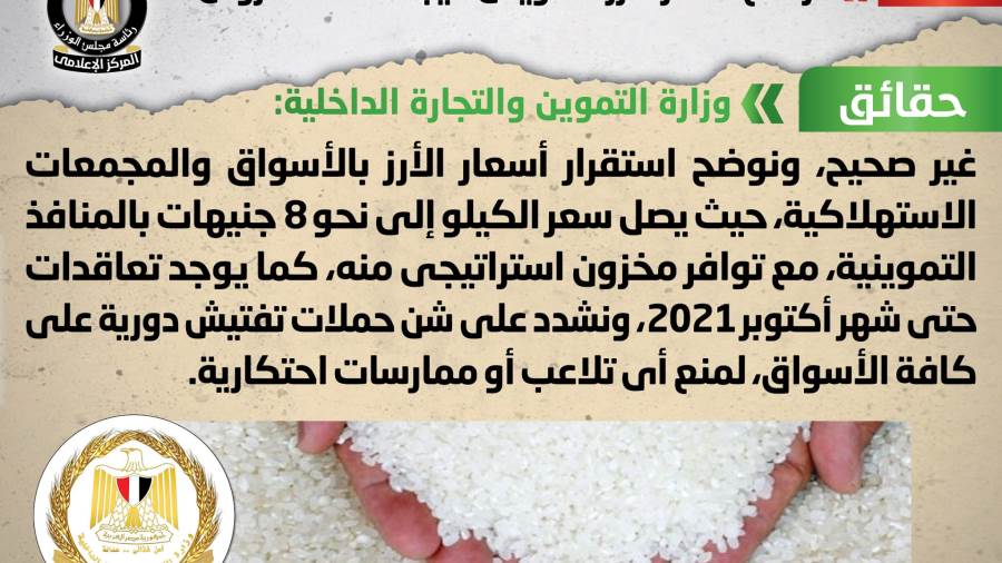 مجلس الوزراء ينفي ارتفاع أسعار الأرز التمويني نتيجة لقلة المعروض