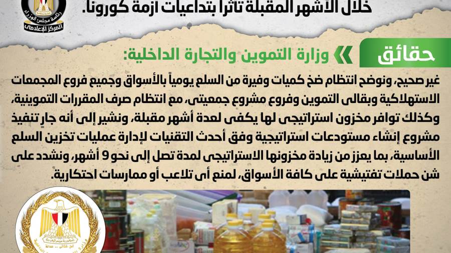 مجلس الوزراء ينفي نقص السلع الأساسية بجميع محافظات خلال الأشهر المقبلة تأثرا بتداعيات أزمة كورونا