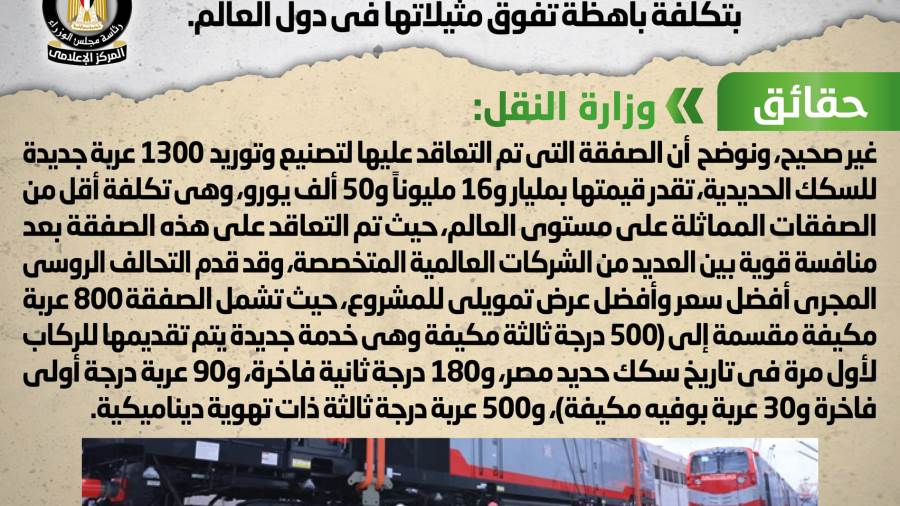 مجلس الوزراء ينفي استيراد عربات قطارات السكك الحديدية بتكلفة باهظة تفوق مثيلاتها في دول العالم