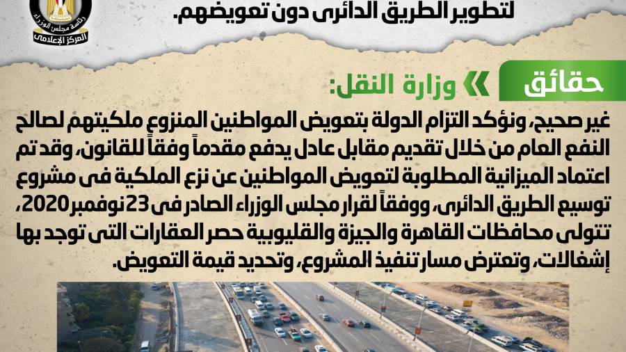 مجلس الوزراء ينفي نزع ملكية مئات الوحدات السكنية من قاطنيها لتطوير الطريق الدائري دون تعويضهم