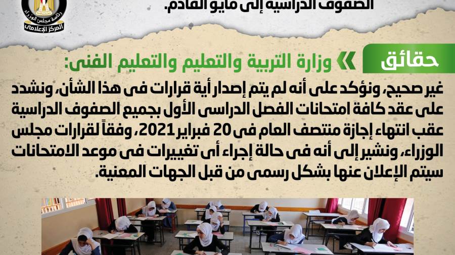 نفى المركز الإعلامي لمجلس الوزراء ما تردد من أنباء بشأن تأجيل عقد امتحانات الفصل الدراسي الأول بجميع الصفوف ا
