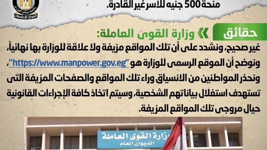 نفى المركز الإعلامي مجلس الوزراء ما ترددت بشأن إطلاق القوى العاملة موقعا إلكترونيا جديدا لصرف منحة 500 جنيه ل