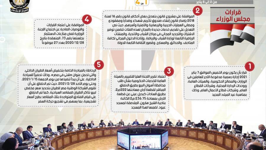 نشر المركز الإعلامي لمجلس الوزراء تقريرا شمل إنفوجرافات سلط من خلالها الضوء على الحصاد الأسبوعي لمجلس الوزرا