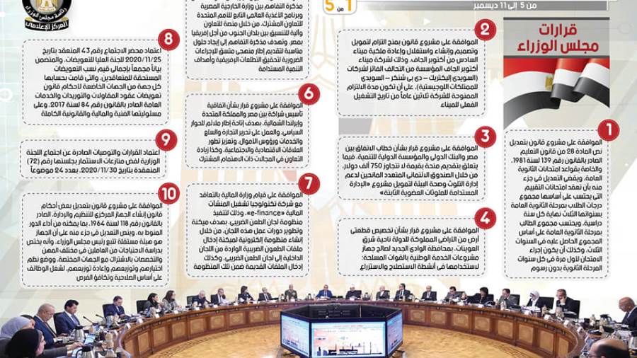 نشر المركز الإعلامي لمجلس الوزراء تقريرا شمل إنفوجرافات سلط من خلالها الضوء على الحصاد الأسبوعي لمجلس الوزرا