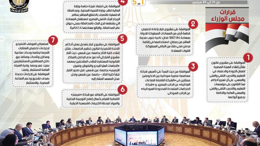 نشر المركز الإعلامي لمجلس الوزراء تقريرا شمل إنفوجرافات سلط من خلالها الضوء على الحصاد الأسبوعي لمجلس الوزرا