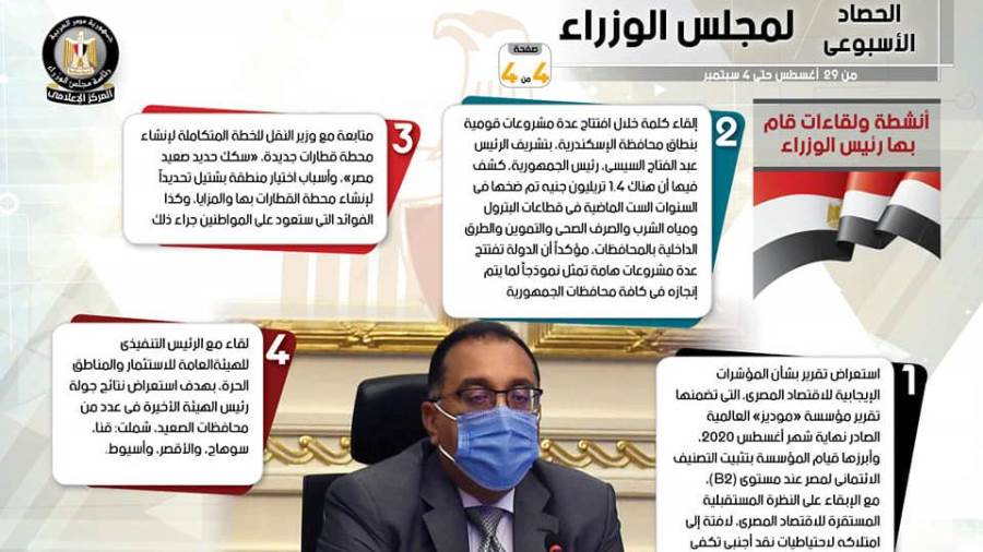 نشر المركز الإعلامي لمجلس الوزراء تقريرا شمل إنفوجرافات سلط من خلالها الضوء على الحصاد الأسبوعي لمجلس الوزرا