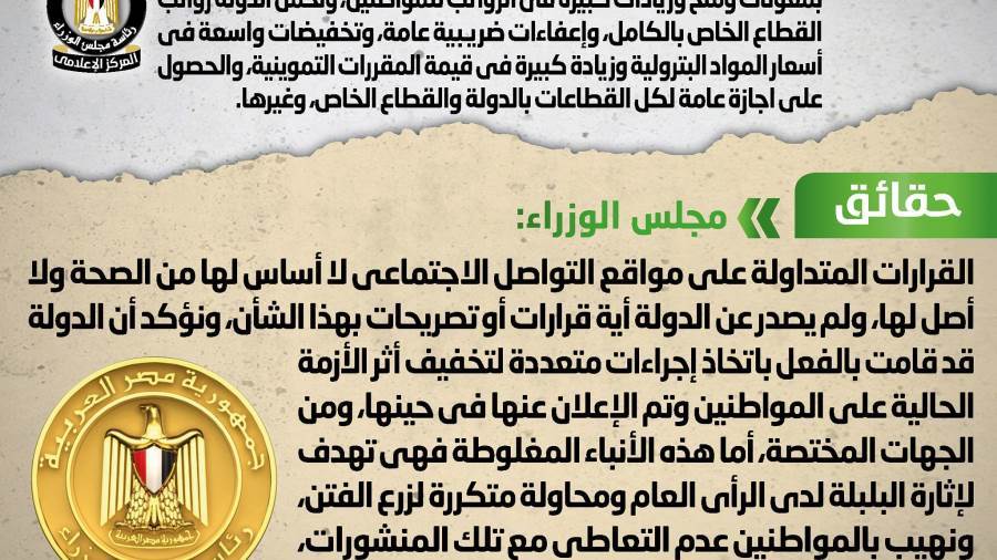 كشف المركز الإعلامى لمجلس الوزراء إنه فى ضوء ما تم تداوله من رسائل نصية عبر صفحات مواقع التواصل الاجتماعي وتطب